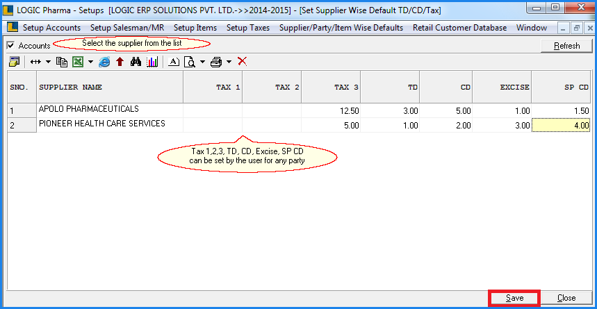 You can set Tax 1, Tax 2, Tax 3, CD, TD, Excise, SP CD for the selected supplier.