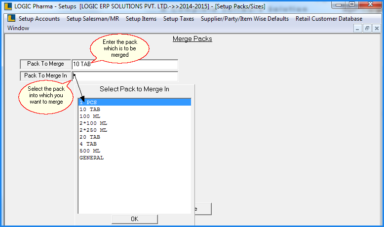 A message box asking for confirmation will appear.Click on yes to confirm the merge.If the Pack/size has been successfully merged then a Message Box will be displayed indicating successful merge.