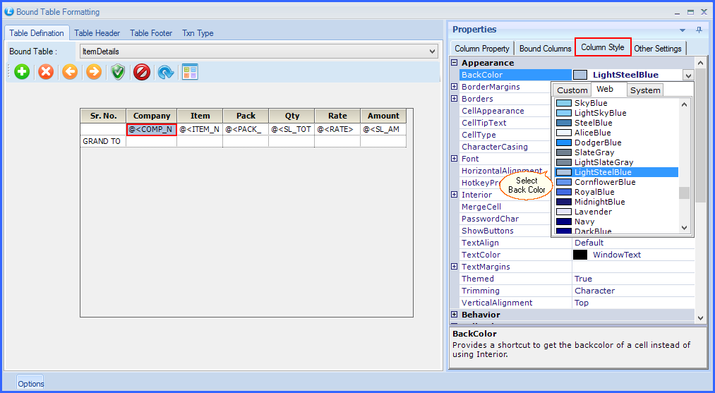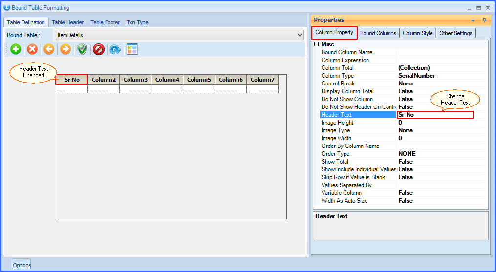 Column Style is used to give a special style to your Columns.There are many features in this tab. Few of them are as mentioned below that you can add in your Bound Table.
