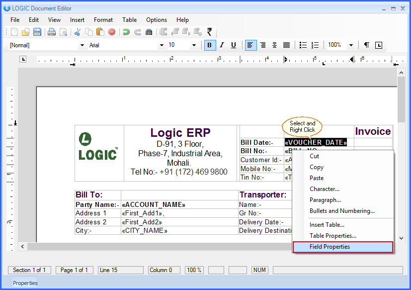 1) Select the Field, (for which you want to change the Properties) and then Click Right. Choose Field Properties. |