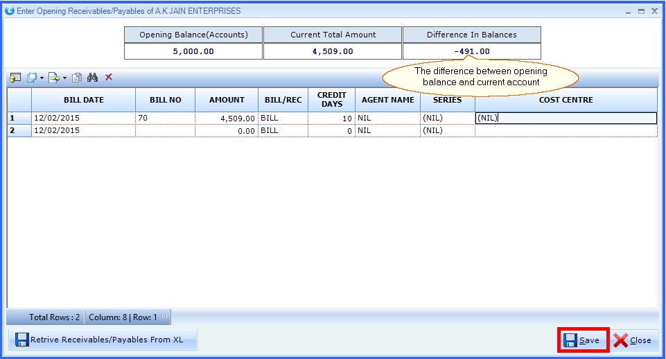 Clicking on Entering Opening Bills Receivable/Payable will open up a form which will enable the user to view exactly how the Opening Balance has been summed up. The user can also enter the details of how exactly the Opening Balance was generated.
