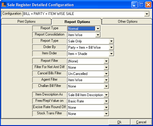 Click Configuration button or press F5. Click the Report Options and select the Report Type as Normal,Report Consolidation as Item Wise,Order By as Party + Item + Bill Wise,Item Order as Item + Shade .